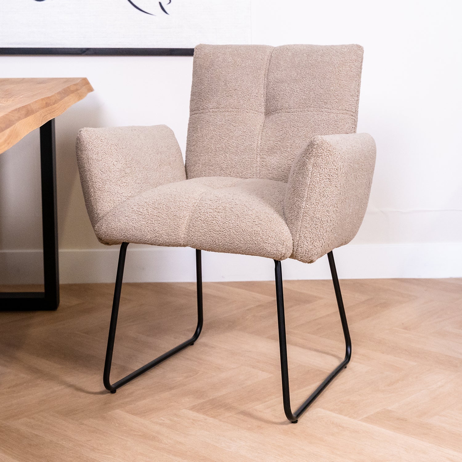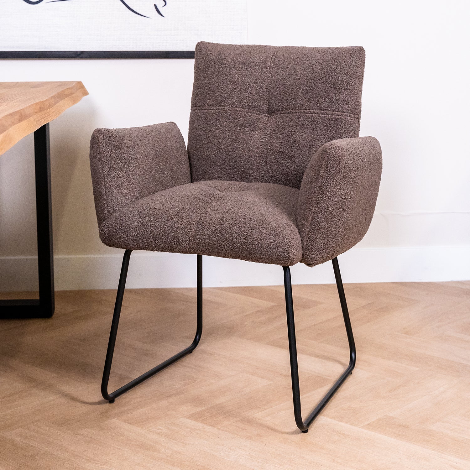 Eetkamerstoel Dante is een hippe eetkamerstoel in een populaire Teddy stof. Deze heerlijke zachte stof past perfect in een modern en chique interieur. Eetkamerstoel Dante is daarnaast ook nog eens uitgerust met een enorm dik gestoffeerde zitting, rugleuning en armleuningen. Dit geeft deze Teddy eetkamerstoel een bijzonder hoog knuffel gehalte. Want zeg nou eerlijk, wil jij niet direct op deze stoel gaan zitten nu je hem ziet?