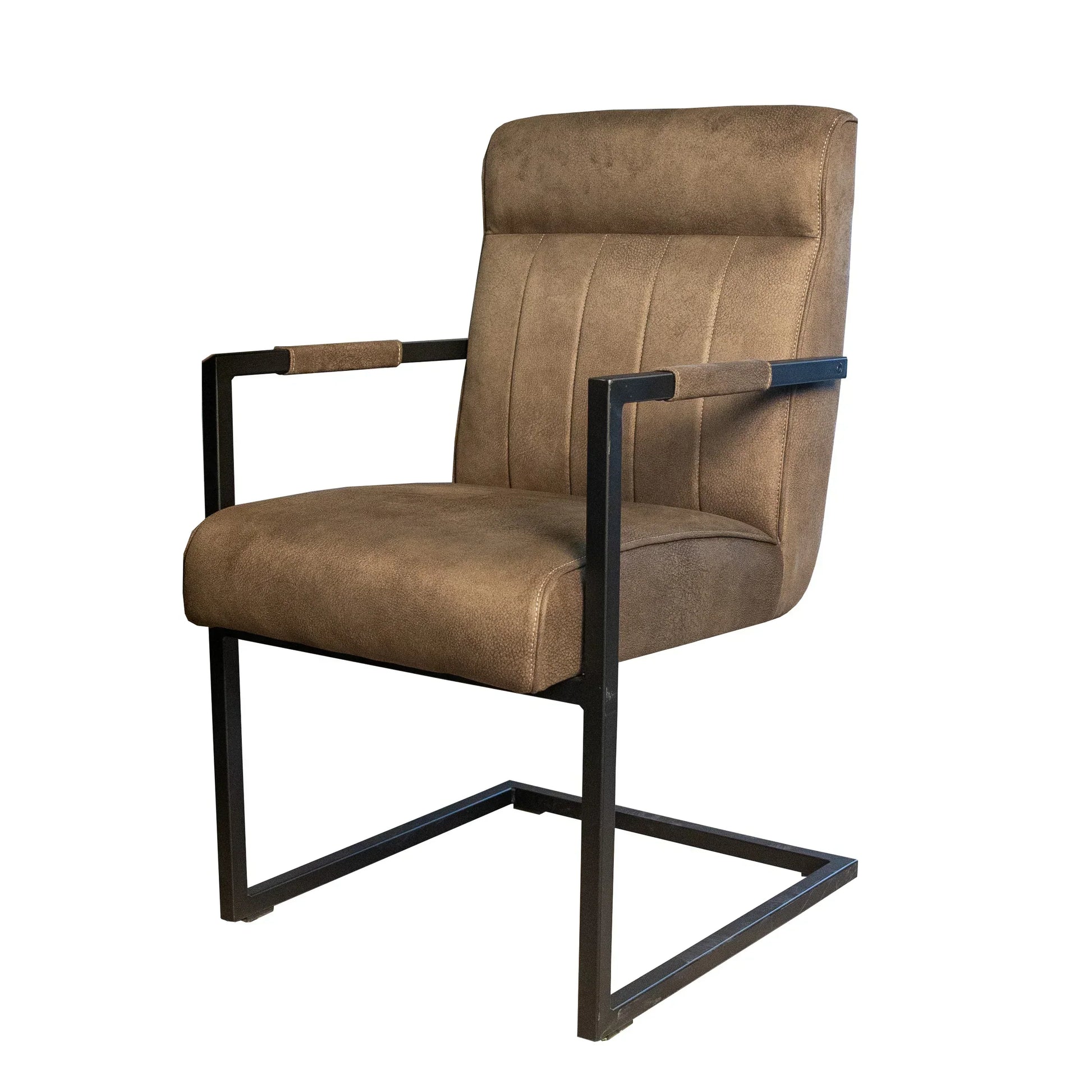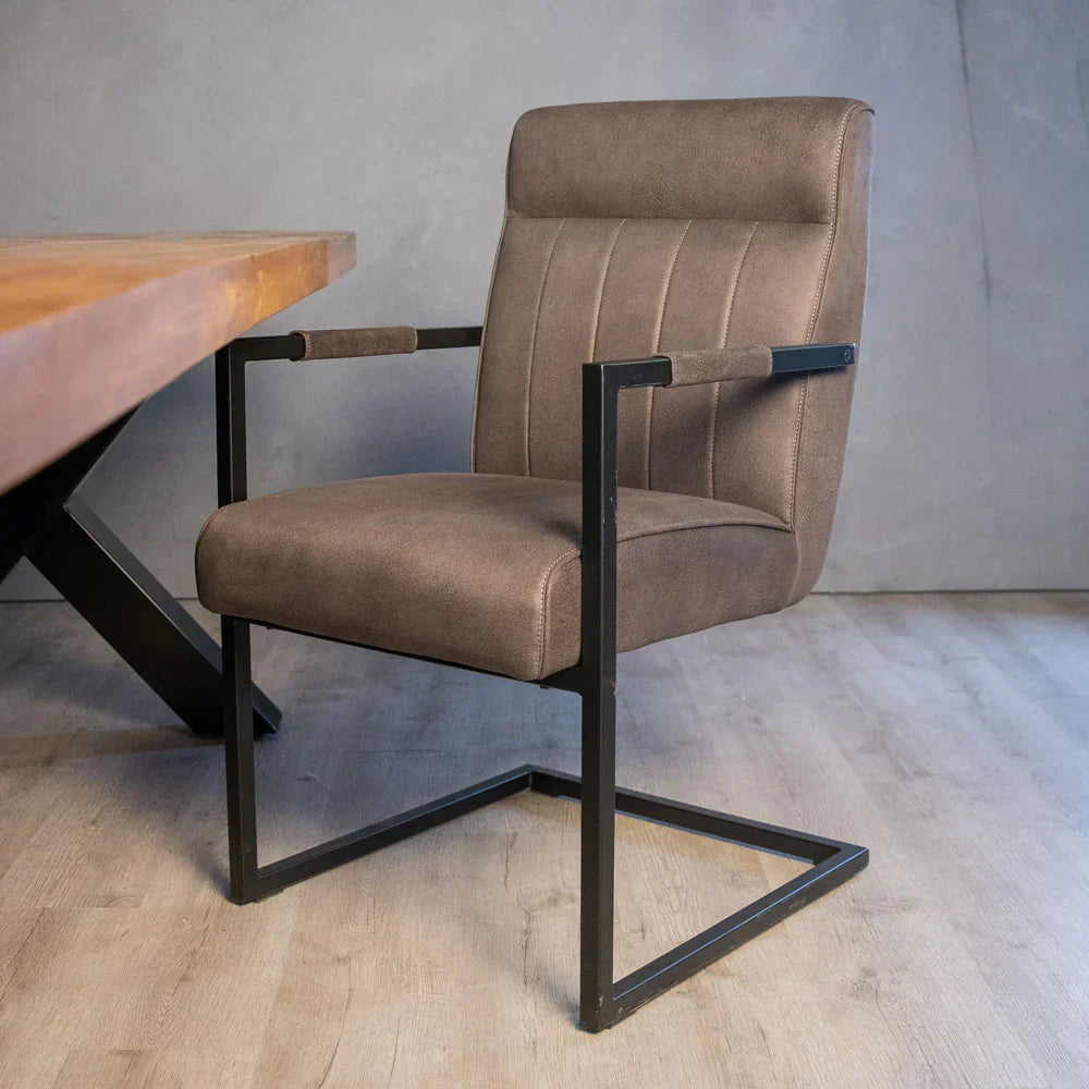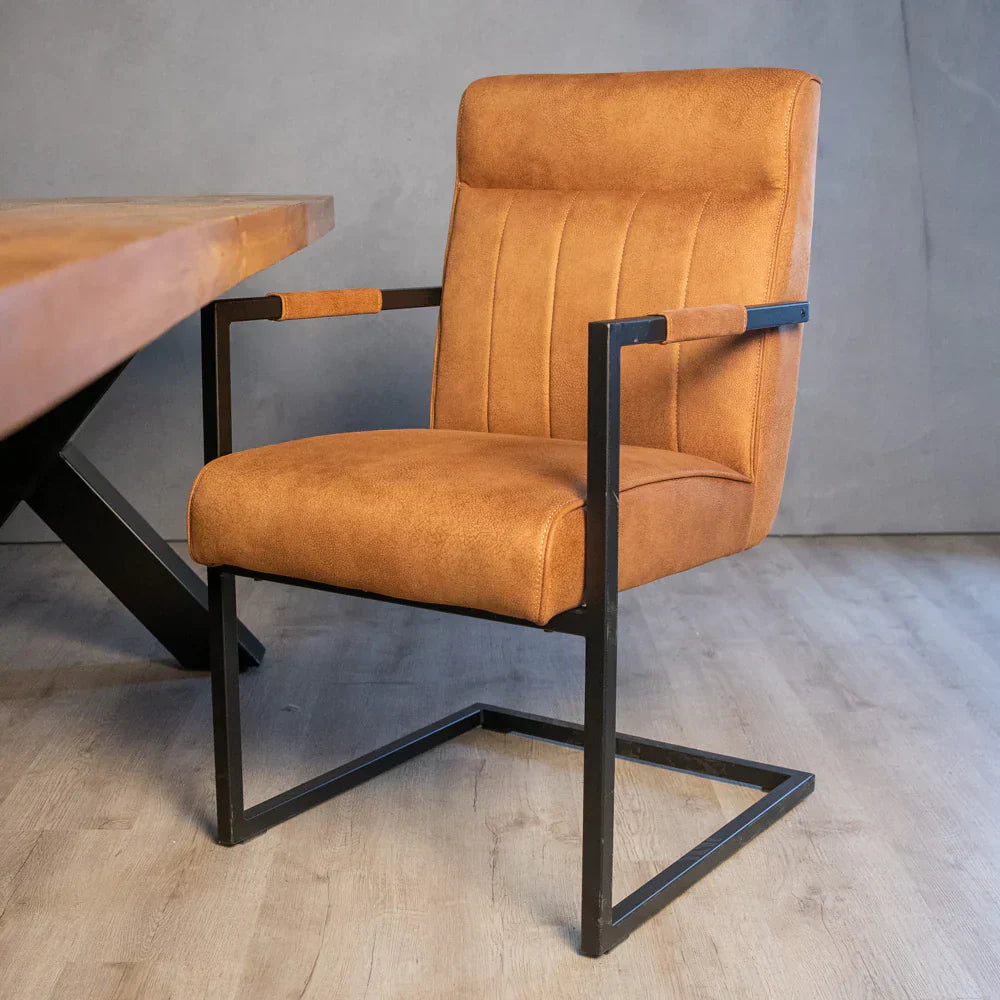 Deze eetkamerstoel met armleuningen is beschikbaar in drie populaire kleuren die perfect passen in een modern of industrieel interieur. Namelijk Army groen, Antraciet (grijs) en Cognac.